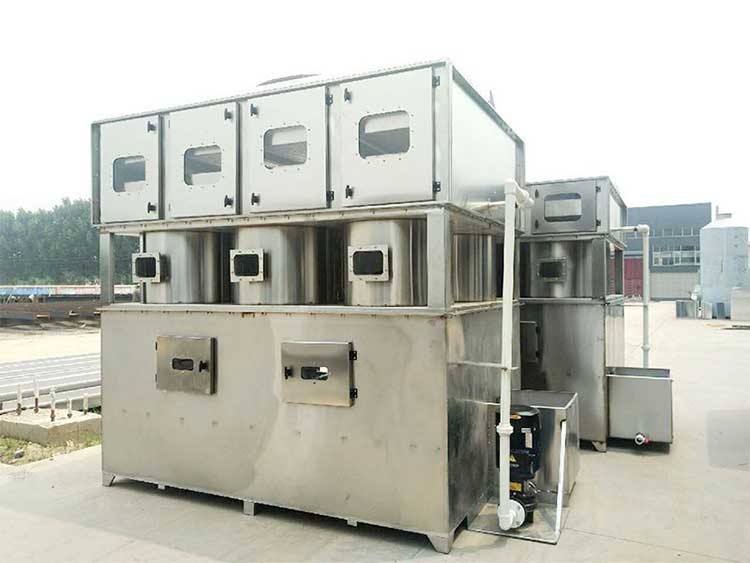 一級旋流板塔)然后再進(jìn)入干式過濾器,在室中以緩慢速度通過,接觸時間為1.0秒以上,去除廢氣
