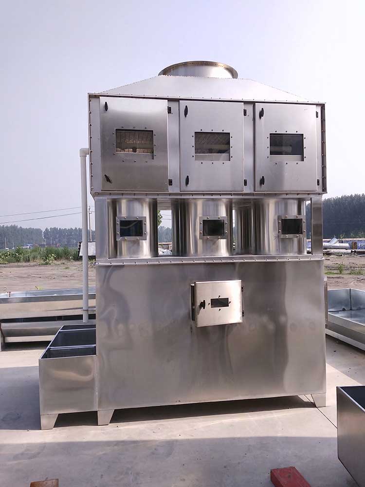 一、旋流脫硫塔工作時含塵廢氣由風(fēng)管引入旋流塔內(nèi),經(jīng)過旋轉(zhuǎn)洗滌桶風(fēng)帶加快,帶動填料球飛帶運轉(zhuǎn),在洗滌桶里,含塵廢氣與水霧充分混合洗滌、中和反應(yīng)(水里面補充有酸堿時),廢氣經(jīng)過凈化后,再經(jīng)除霧層脫水除霧后由風(fēng)機排入大氣或再進(jìn)入其他凈化設(shè)備(光氧催化設(shè)備、活性炭吸附箱、催化燃燒裝置等),吸收液在塔底經(jīng)水泵增壓后在箱頂噴淋霧化而下,回流至箱底循環(huán)使用。
