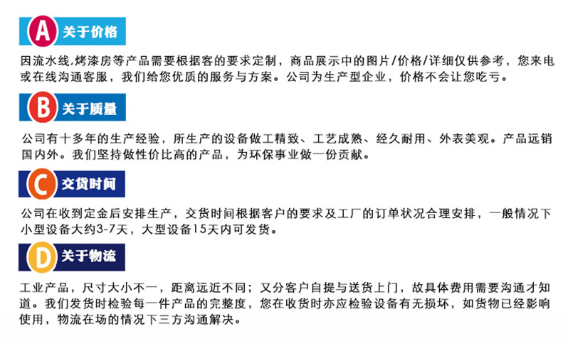 公司的環(huán)保設(shè)備有VOCs廢氣處理設(shè)備、工業(yè)粉塵處理設(shè)備兩大類。廢氣治理環(huán)保設(shè)備有催化燃燒設(shè)備、pp噴淋塔、活性炭吸附箱、移動伸縮噴漆房氣旋塔、水簾噴漆柜、漆水分離一體機等環(huán)保設(shè)備。粉塵處理設(shè)備包括濾筒式脈沖除塵器、布袋除塵器、打磨吸塵工作、水簾式打磨臺等設(shè)備。我們可以根據(jù)企業(yè)的實際情況定制合適的環(huán)保設(shè)備。歡迎您來電咨詢15665879292,或者添加網(wǎng)頁下面微信,把您的廢氣治理需求告訴我們,我們?yōu)槟峁┰O(shè)備的詳細參數(shù)、配置及價格,為你提供相關(guān)設(shè)備的案例圖片或視頻,同時可以給您發(fā)公司車間正在加工設(shè)備的視頻或圖片。