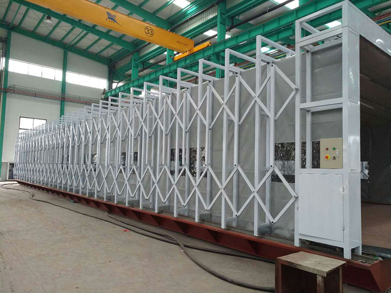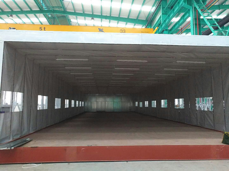 ***種是移動(dòng)伸縮式噴漆房,伸縮房一端固定,固定端可配置粉塵收集回收設(shè)備或者漆霧收集處理設(shè)備,另一端伸縮,方便工件來回運(yùn)轉(zhuǎn)。工件準(zhǔn)備時(shí),伸縮房收縮;工件到達(dá)伸縮房內(nèi)***區(qū)域,伸縮房伸展;噴漆工作完成后,收縮房體,工件移出。此種伸縮房是現(xiàn)在使用***多的伸縮房,其長寬高根據(jù)企業(yè)的實(shí)際情況定制。