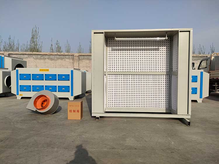 環(huán)保干式噴漆柜,用折流式過濾紙、玻纖過濾棉相結合方法,可有效吸收超范圍的噴涂漆霧。過噴氣流先經(jīng)過折流紙,使氣流多次改動流動方向,這樣那些比空氣重的顆粒會粘附在折流板壁上,不會隨氣流而帶走,部分細微顆粒經(jīng)過纖維過濾棉進行二次過濾,漆霧凈化作用高達98%以上。去除漆霧的有機氣體再經(jīng)過活性炭吸附箱或光氧催化設備凈化后高空排放。