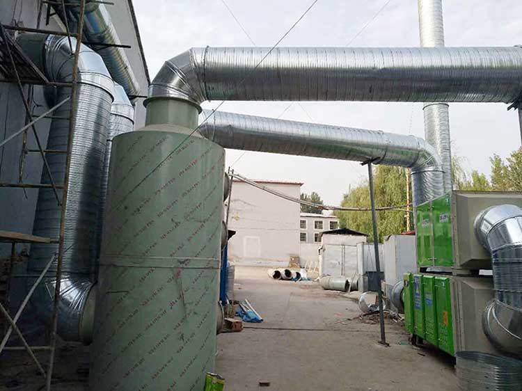 1.1、噴涂過程中,大部分油漆吸附在工件表面。小部分形成漆霧顆粒飄散在空中,漆霧濃度較高,粒徑較小。如果不進(jìn)行預(yù)處理將漆霧塵粒凈化,活性炭的微孔會很快被堵塞,活性炭就會失效。故活性炭吸附箱前需要使用PP噴淋塔來去除漆霧。油漆廢氣經(jīng)噴淋塔清洗后,對漆霧起到很好的清潔和降解作用。